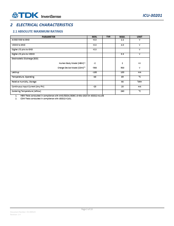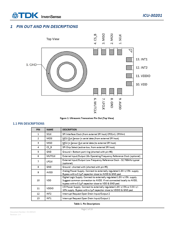 ICU-30201 1.1 PIN DESCRIPTIONS PIN NAME 1 SCLK 2 MOSI 3 MISO 4 CS_B 5 GND 6 MUTCLK 7 LFCLK 8 GND 9 AVDD 10 VDD 11 VDDIO 12 INT2 13 INT1 Document Number: DS-000524 Revision: 1.4 Figure 1: Ultrasonic Transceiver Pin Out (Top View) DESCRIPTION SPI Interface Clock (from external SPI host) CPOL=1, CPHA=1 MCU Out Sensor In serial data (from external SPI host) MCU In Sensor Out serial data (to external SPI host) SPI Chip Select (active-low, from external SPI host) Ground