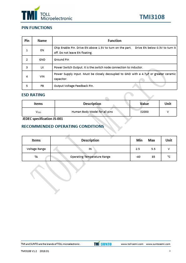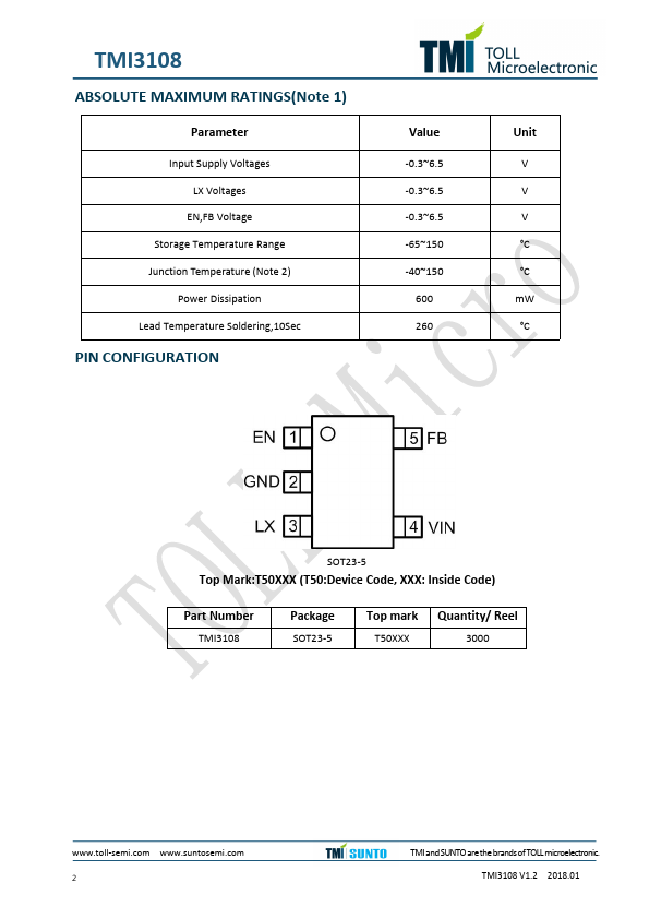 The TMI3108 by TOLL is a 1.5MHz 1A Synchronous Step-DownConverter. Below is the official datasheet preview.
