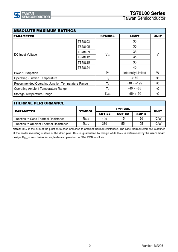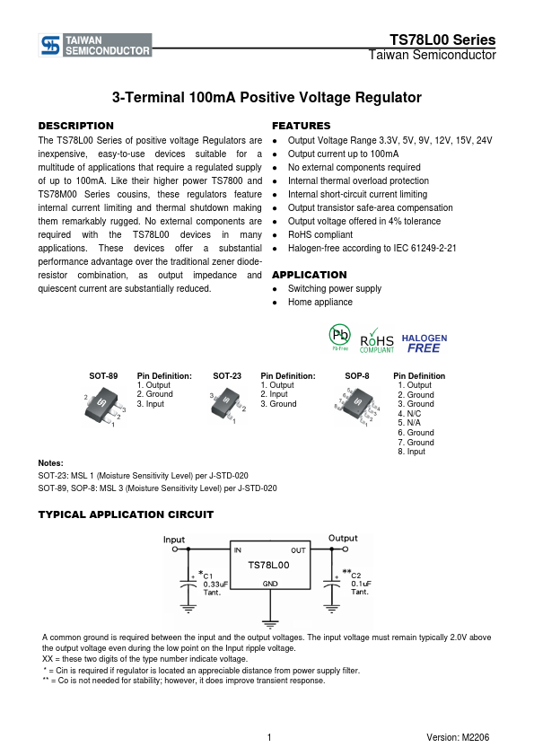 TS78L00 Series Taiwan Semiconductor 3-Terminal 100mA Positive Voltage Regulator .Features