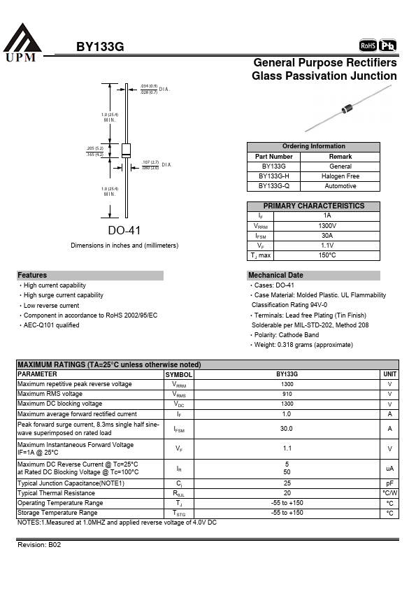BY133G 1.0 (25.4) MIN..034 (0.9) DIA..028 (0.7) .205 (5.2) .165 (4.2) 1.0 (25.4) MIN..107 (2.7) DIA..080 (2.0) DO-41 Dimensions in inches and.Features