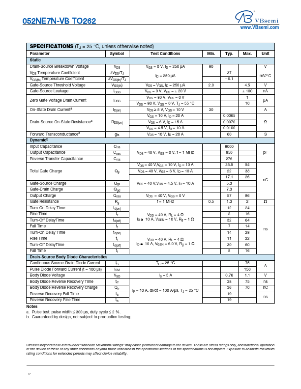 Datasheet Details Part number 052NE7N Manufacturer VBsemi File Size 241.09 KB Datasheet 052NE7N-VBsemi.pdf Description TO262 N-Channel 80V MOSFET