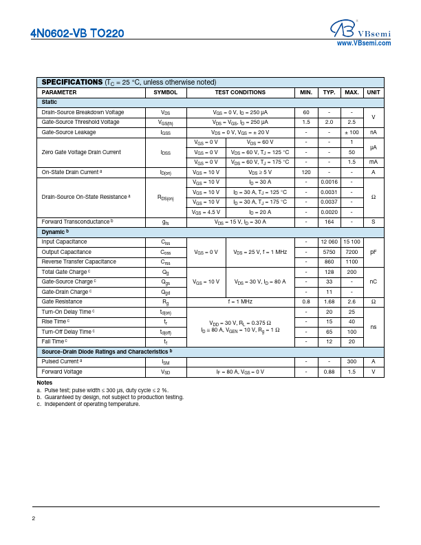 4N0602-VB TO220 4N0602-VB TO220 Datasheet N-Channel 60 V (D-S) MOSFET www.VBsemi.com PRODUCT SUMMARY VDS (V) RDS(on) (Ω) at VGS = 10 V RDS(on) (Ω) a.