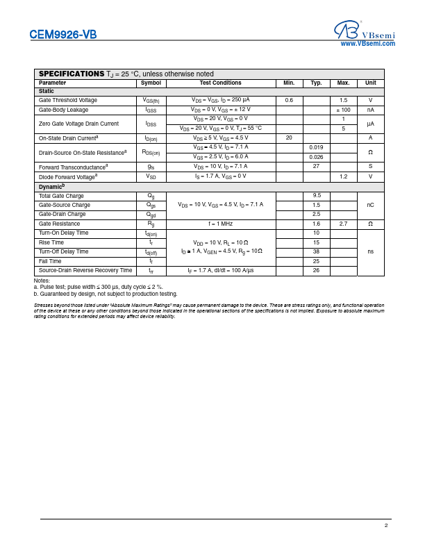 CEM9926-VB CEM9926-VB Datasheet Dual N-Channel 20-V (D-S) MOSFET www.VBsemi.com PRODUCT SUMMARY VDS (V) RDS(on) (Ω) 20 0.019 at VGS = 4.5 V 0.0.CEM9926 Features