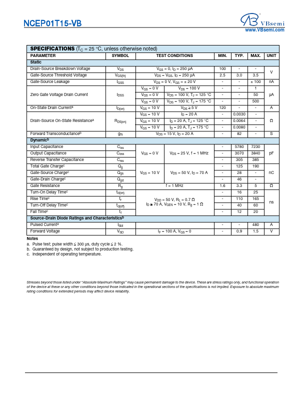 The NCEP01T15 by VBsemi is a N-Channel 100V MOSFET. Below is the official datasheet preview.