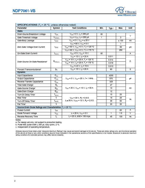 The NDP7061 by VBsemi is a N-Channel 60V MOSFET. Below is the official datasheet preview.