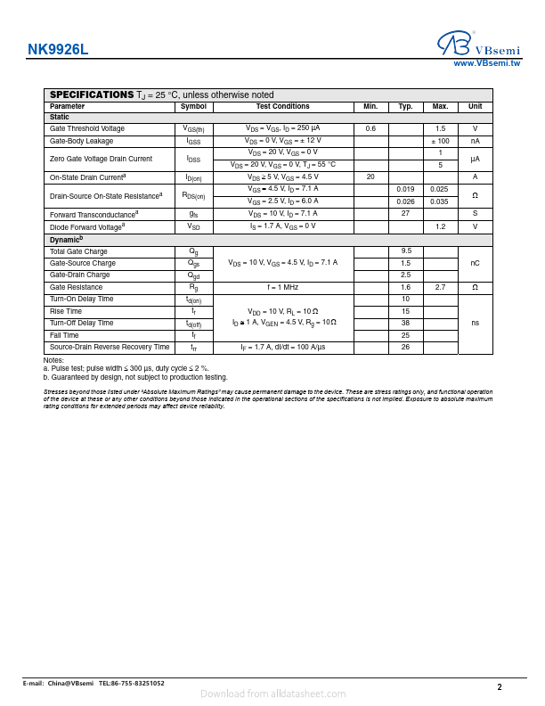NK9926L Dual N-Channel 20-V (D-S) MOSFET www.VBsemi.tw PRODUCT SUMMARY VDS (V) RDS(on) (Ω) 20 0.025 at VGS = 4.5 V 0.035 at VGS = 2.5 V ID (A.NK9926L Features