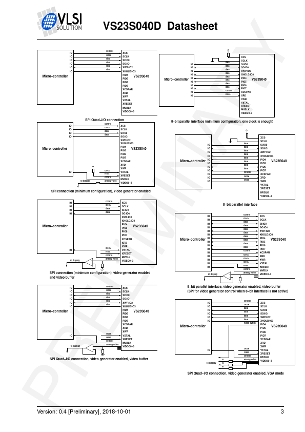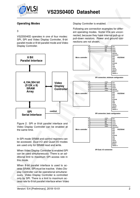 Flexible 1.5V - 3.6V operating voltage 524,288 x 8-bit SRAM organization Serial Peripheral Interface (SPI) mode 0 compatible Byte, Page and Sequential modes Supports Single, Dual and Quad I/O read and write Fast operation: the whole memory can be filled in 1,048,590 or read in 1,048,591 cycles (QuadI/O SPI, Quad address mode) The VLSI Solution VS23S040D is an easy-touse and versatile serial SRAM device.The memory is accessed via an SP