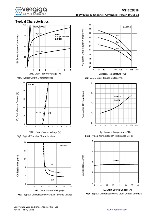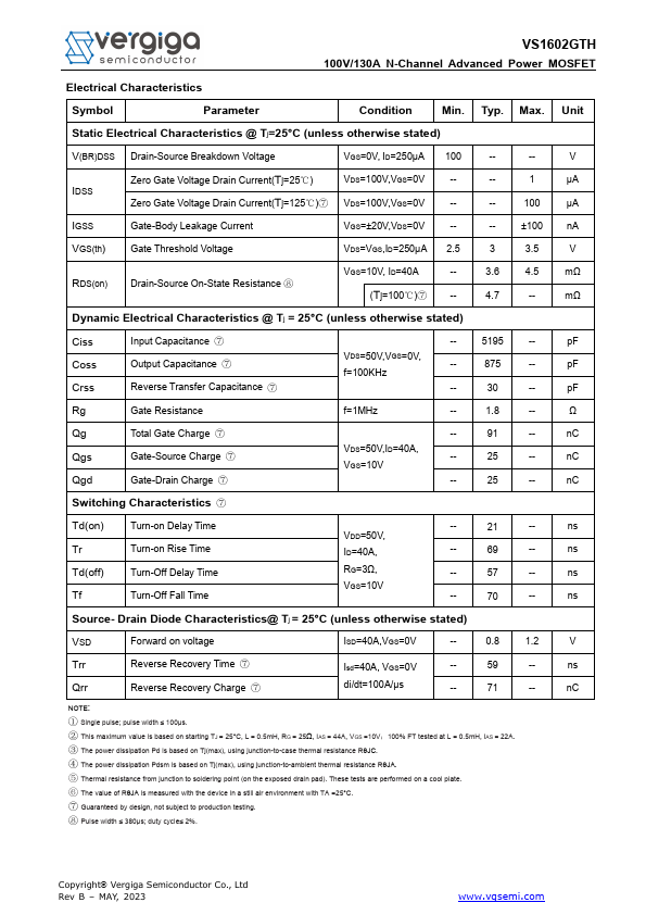 The VS1602GTH by Vergiga is a 100V/130A N-Channel Advanced Power MOSFET. Below is the official datasheet preview.
