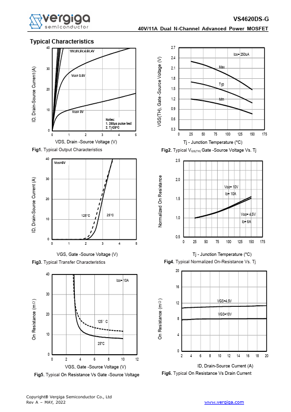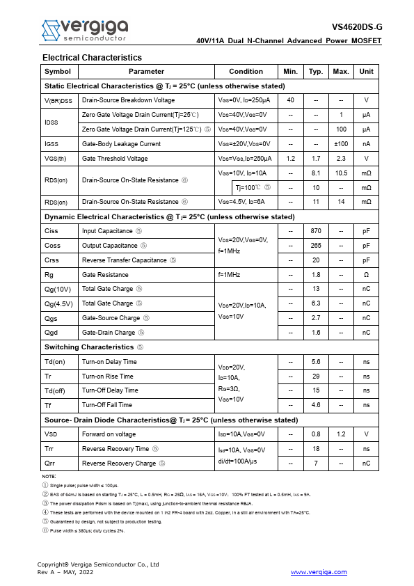 The VS4620DS-G by Vergiga is a 40V/11A Dual N-Channel Advanced Power MOSFET. Below is the official datasheet preview.