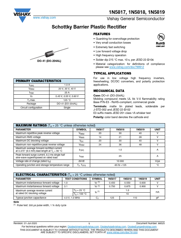 www.vishay.com 1N5817, 1N5818, 1N5819 Vishay General Semiconductor Schottky Barrier Plastic Rectifier DO-41 (DO-204AL) PRIMARY CHARACTERISTICS IF.Features