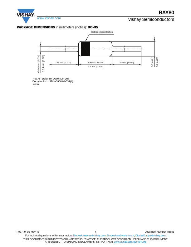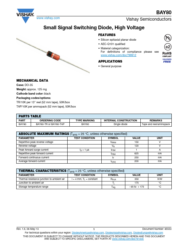 www.vishay.com BAY80 Vishay Semiconductors Small Signal Switching Diode, High Voltage MECHANICAL DATA Case: DO-35 Weight: approx.125 mg Cathode ba.Features