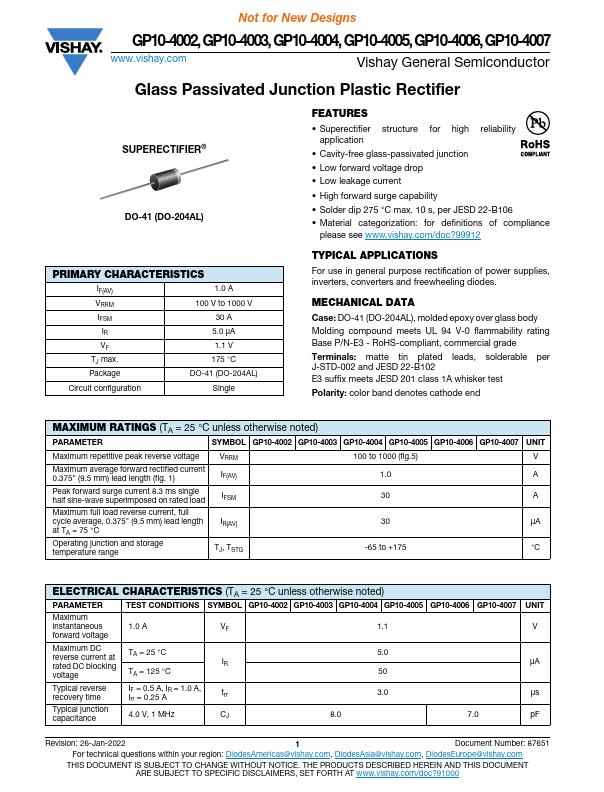 Not for New Designs GP10-4002, GP10-4003, GP10-4004, GP10-4005, GP10-4006, GP10-4007 www.vishay.com Vishay General Semiconductor Glass Passivated .Applications