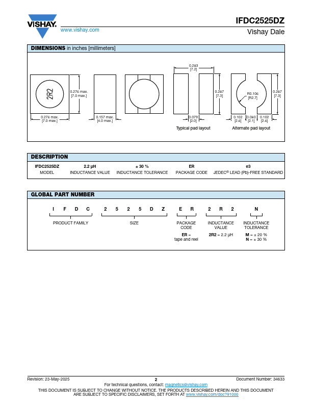 www.vishay.com IFDC2525DZ Vishay Dale Ferrite Power Inductor, Shielded Drum Core LINKS TO ADDITIONAL RESOURCES Product Page ELECTRICAL SPECIFICATIO.IFDC2525DZ Features