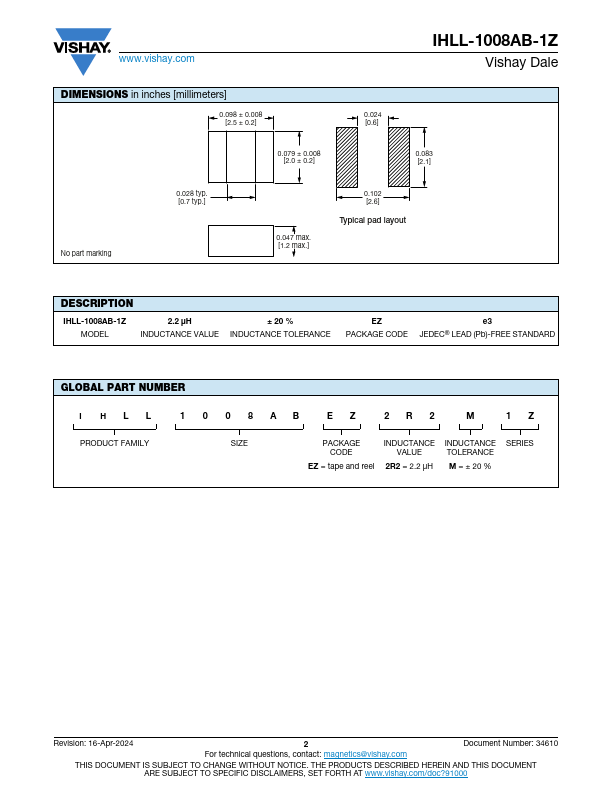 www.vishay.com IHLL-1008AB-1Z Vishay Dale Commercial Power Inductor, Low DCR .