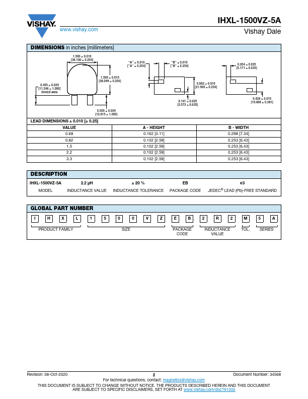 www.vishay.com IHXL-1500VZ-5A Vishay Dale High Current Through-Hole Inductor, High Temperature .IHXL-1500VZ-5A Features