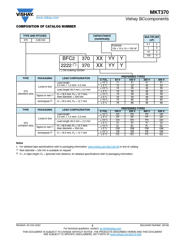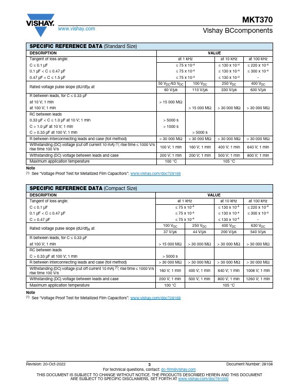 VALUE Tangent of loss angle: C ≤ 0.1 μF 0.1 μF < C ≤ 0.47 μF 0.47 μF < C ≤ 1.5 μF Rated voltage pulse slope (dU/dt)R at R between leads, for C ≤ 0.33 μF at 10 V; 1 min at 100 V; 1 min at 1 kHz ≤ 75 x 10-4 ≤ 75 x 10-4 ≤ 75 x 10-4 50 VDC/63 VDC 100 VDC 60 V/μs 110 V/μs at 10 kHz ≤ 130 x 10-4 ≤ 130 x 10-4 ≤ 130 x 10-4 250 VDC 330 V/μs > 15 000 MΩ > 15 000 MΩ > 30 000 MΩ RC between leads 0.33 μF < C ≤ 1.0 μF at 10 V; 1 min C > 1.0 μF at 10 V; 1 min > 5000 s > 1000 s C > 0.33 μF at 100