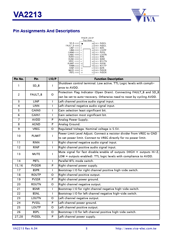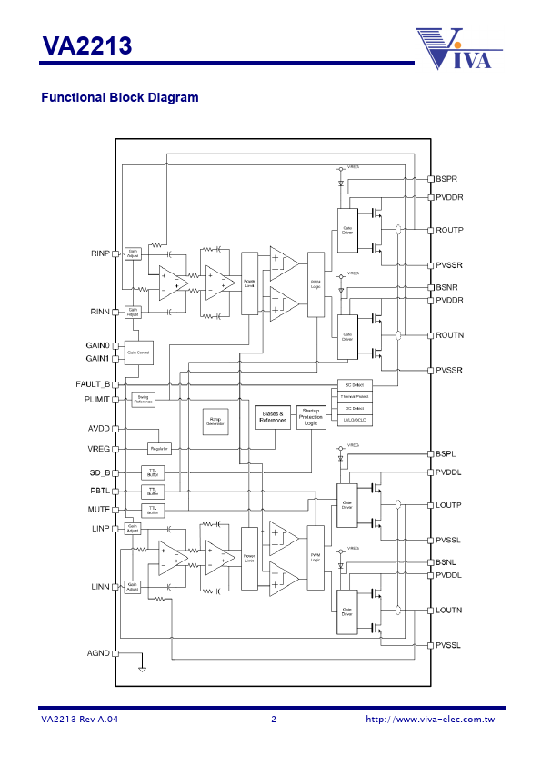 The VA2213 by Viva Electronics is a 15W Filterless Stereo Class D Audio Amplifier. Below is the official datasheet preview.