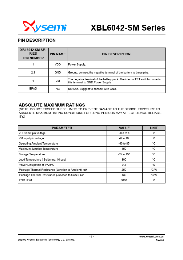 The XBL6042-SM by XySemi is a One Cell Lithium-ion/Polymer Battery Protection IC. Below is the official datasheet preview.