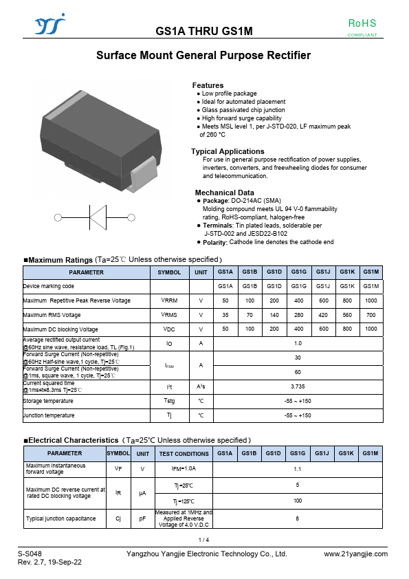 GS1A THRU GS1M Surface Mount General Purpose Rectifier RoHS COMPLIANT .