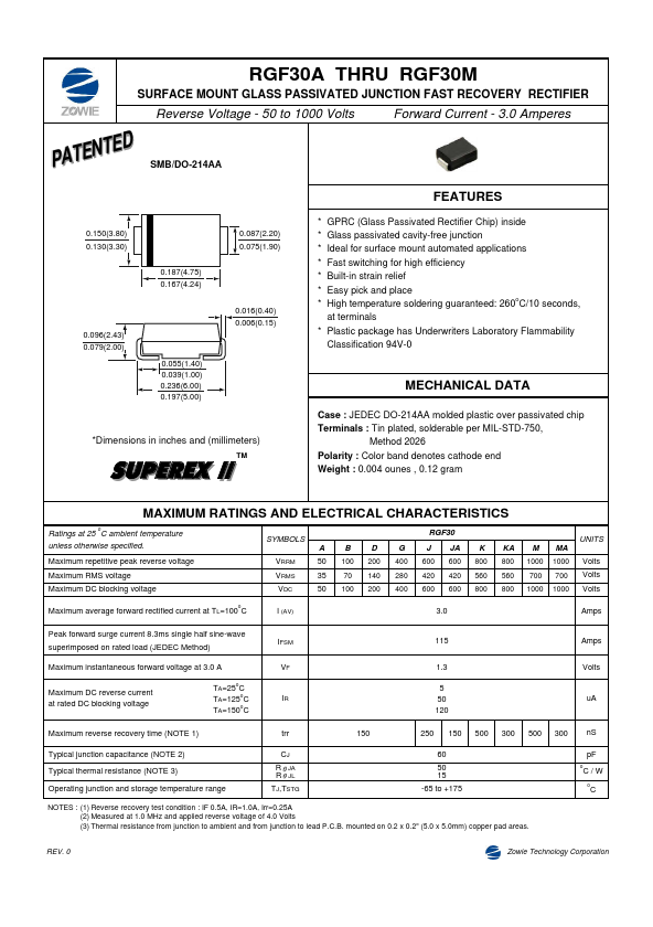 • RGF30DH - SURFACE MOUNT GLASS PASSIVATED JUNCTION FAST RECOVERY RECTIFIER (Zowie Technology)
