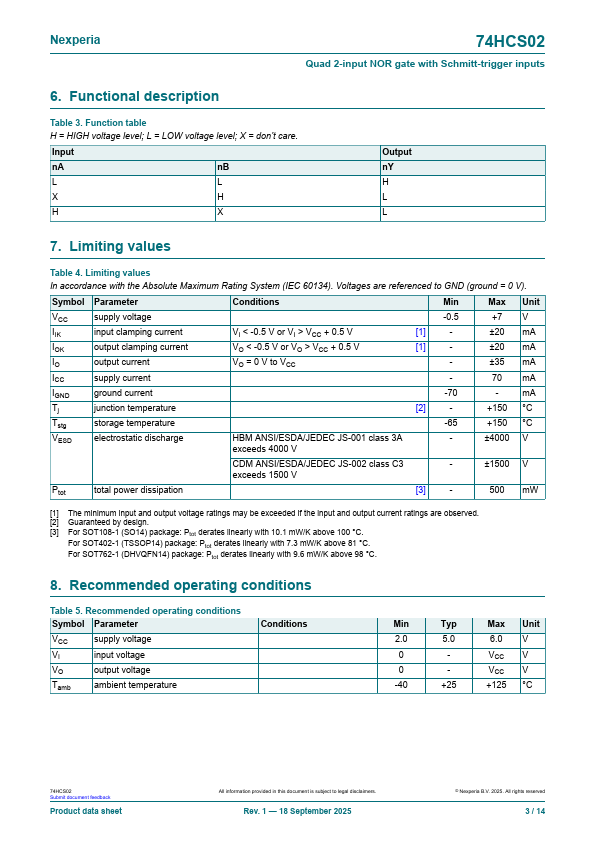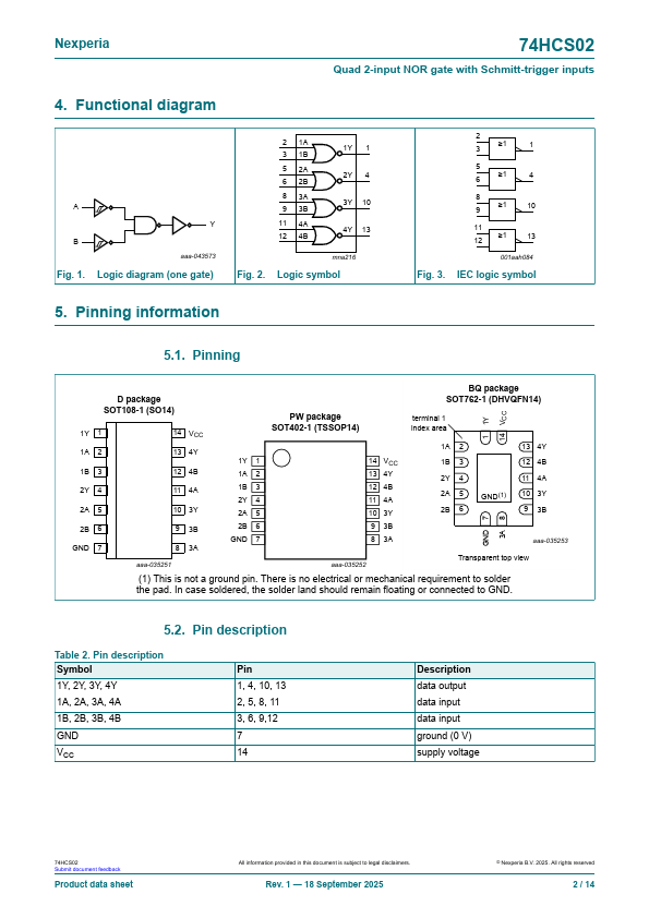 74HCS02 Quad 2-input NOR gate with Schmitt-trigger inputs Rev.1 * 18 September 2025 Product data sheet 1.General .74HCS02 Features