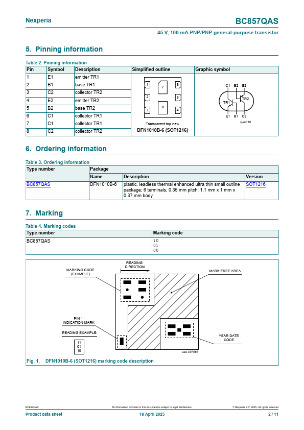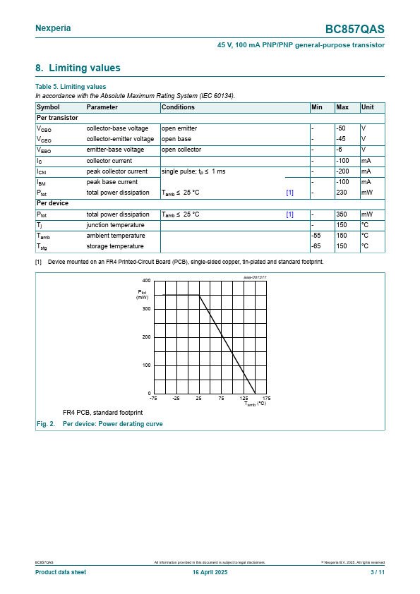 The BC857QAS by nexperia is a 45V 100mA PNP/PNP general-purpose transistor. Below is the official datasheet preview.