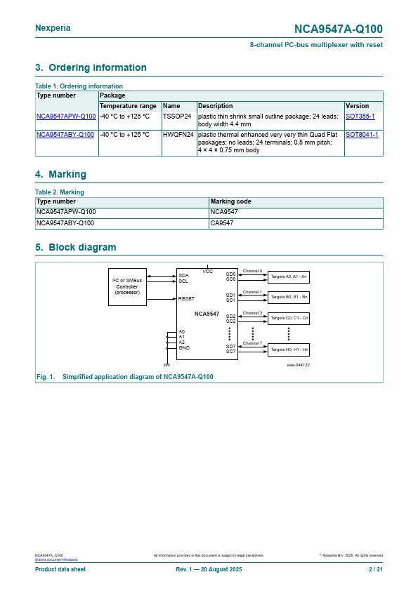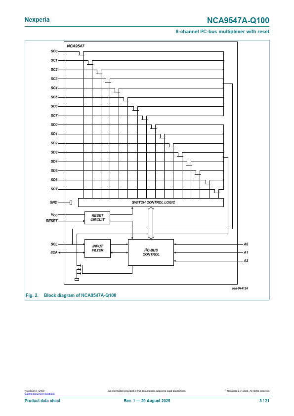 NCA9547A-Q100 8-channel I²C-bus multiplexer with reset Rev.1 * 20 August 2025 Product data sheet 1.General .NCA9547A-Q100 Features