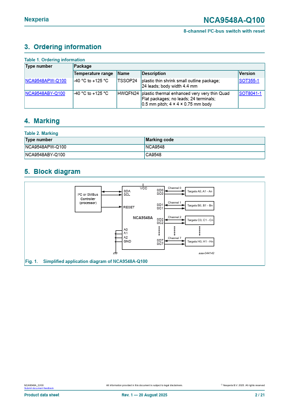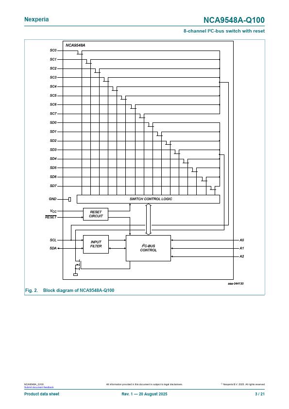 NCA9548A-Q100 8-channel I²C-bus switch with reset Rev.1 * 20 August 2025 Product data sheet 1.General .NCA9548A-Q100 Features
