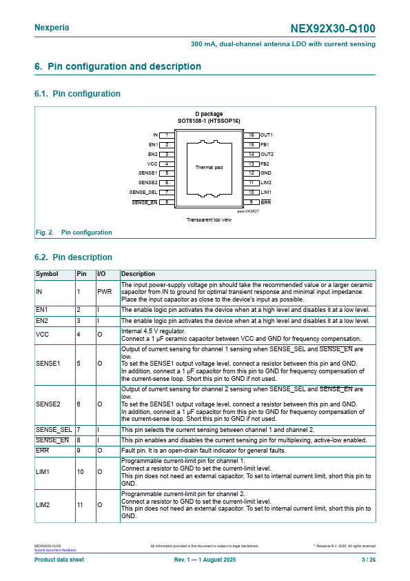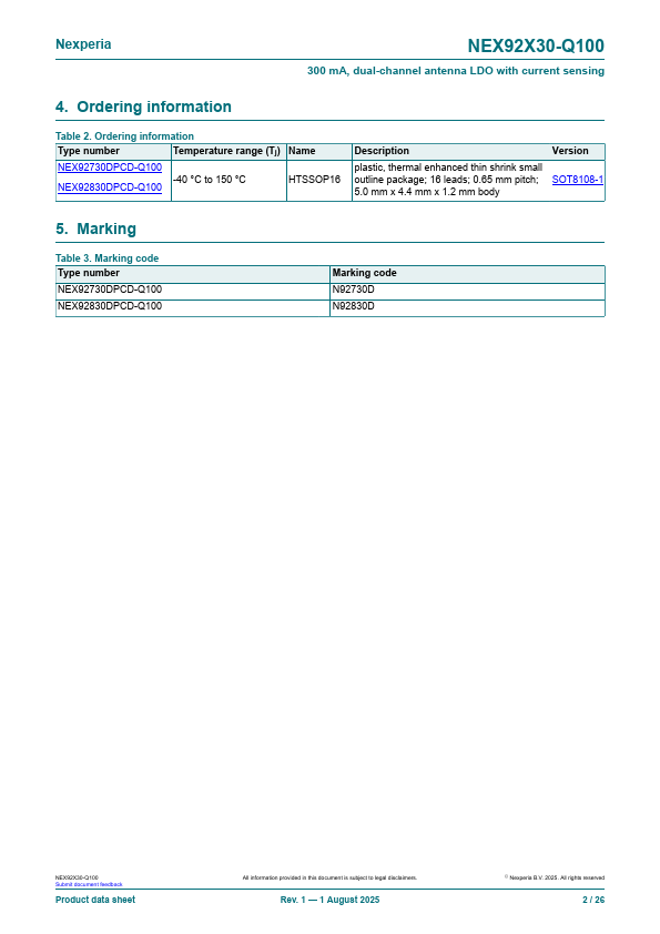 HTSSOP16 NEX92X30-Q100 300 mA, dual-channel antenna LDO with current sensing Rev.1 * 1 August 2025 Product data sheet 1.General descrip.NEX92X30-Q100 Applications