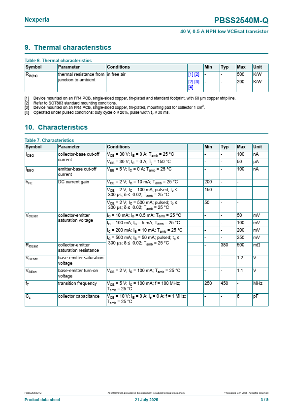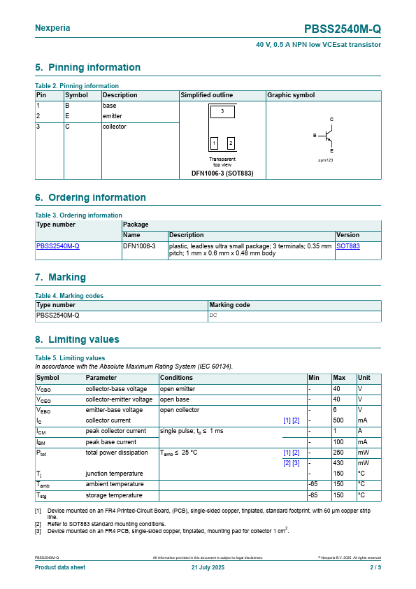 PBSS2540M-Q 40 V, 0.5 A NPN low VCEsat transistor 21 July 2025 Product data sheet 1.General .PBSS2540M-Q Features