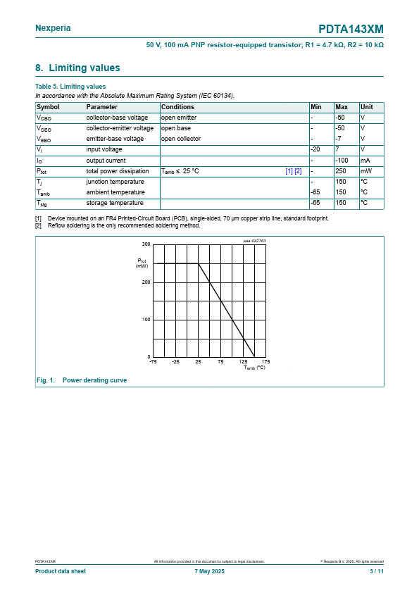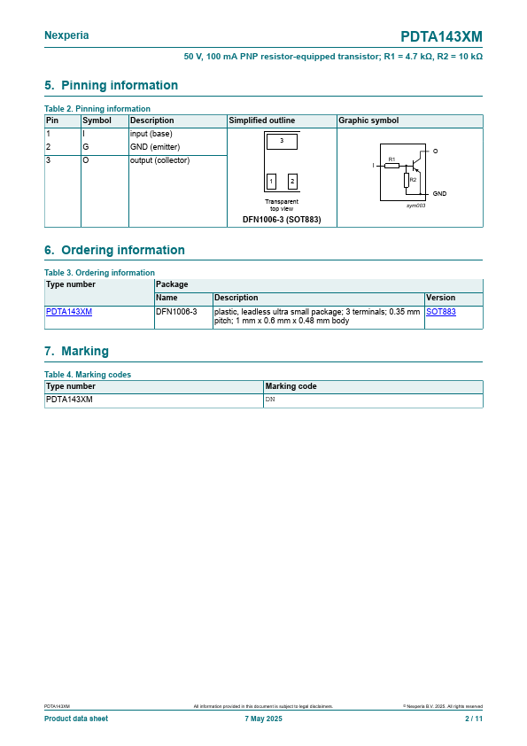 PDTA143XM 50 V, 100 mA PNP resistor-equipped transistor; R1 = 4.7 kΩ, R2 = 10 kΩ 7 May 2025 Product data sheet 1.General .PDTA143XM Features