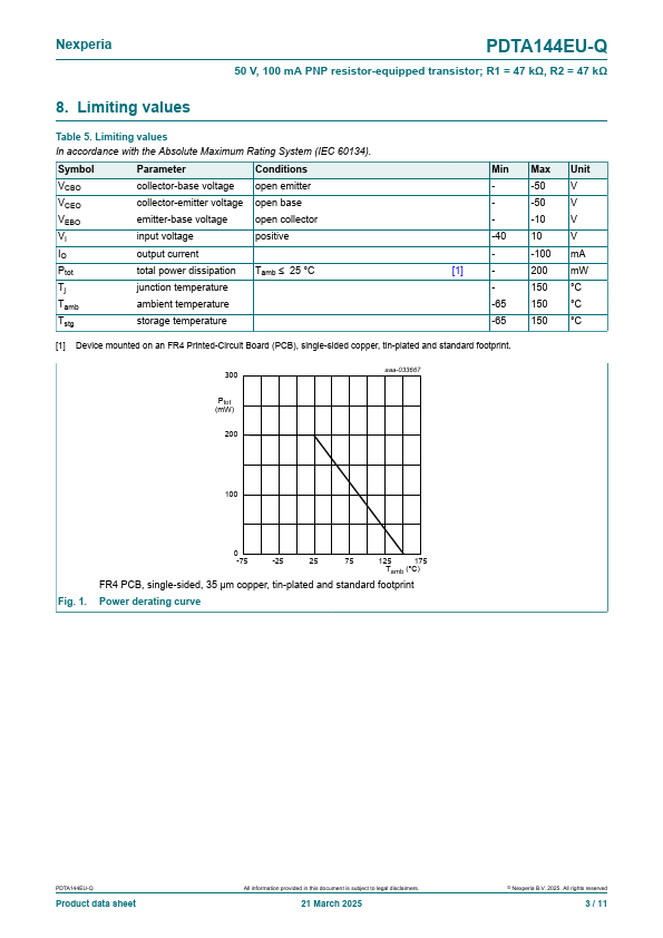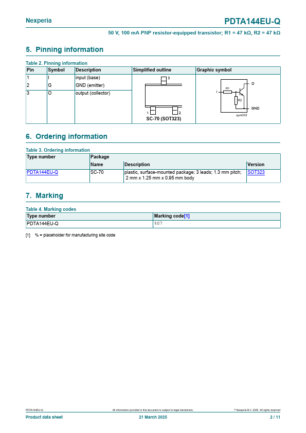 PDTA144EU-Q 50 V, 100 mA PNP resistor-equipped transistor; R1 = 47 kΩ, R2 = 47 kΩ 21 March 2025 Product data sheet 1.General .PDTA144EU-Q Features