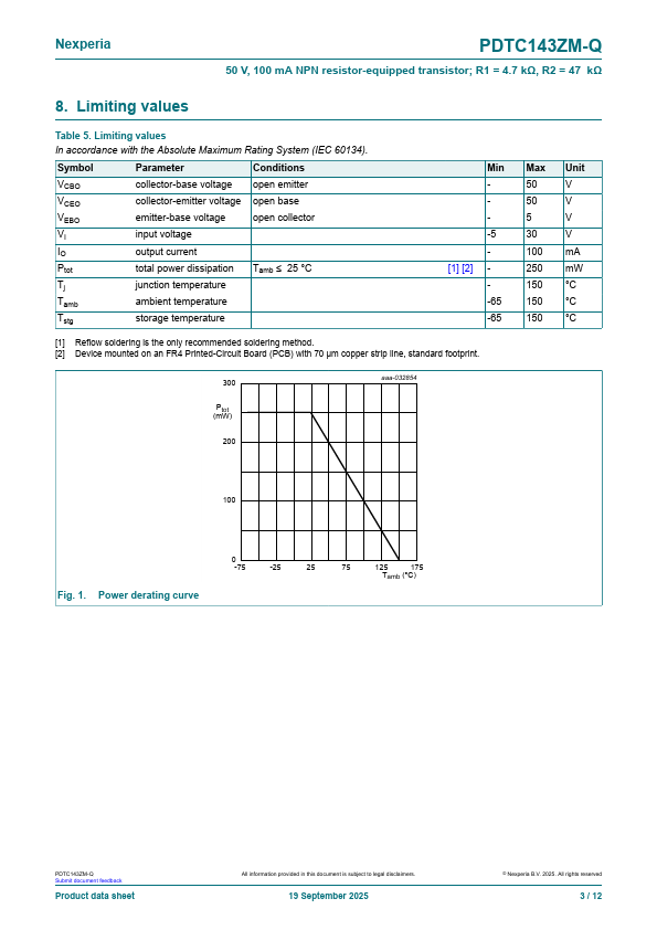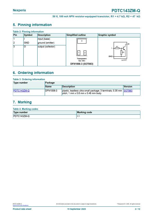 PDTC143ZM-Q 50 V, 100 mA NPN resistor-equipped transistor; R1 = 4.7 kΩ, R2 = 47 kΩ 19 September 2025 Product data sheet 1.General .PDTC143ZM-Q Features