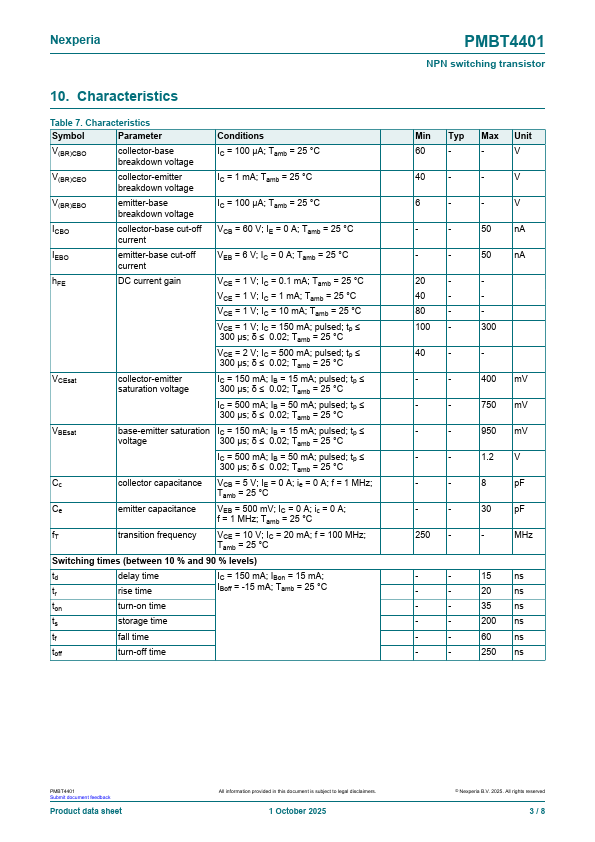 PMBT4401 NPN switching transistor 1 October 2025 Product data sheet 1.General .PMBT4401 Features