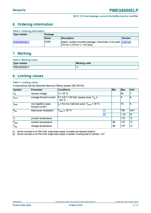 PMEG6050ELP 60 V, 5 A low leakage current Schottky barrier rectifier 10 March 2025 Product data sheet 1.General .PMEG6050ELP Features