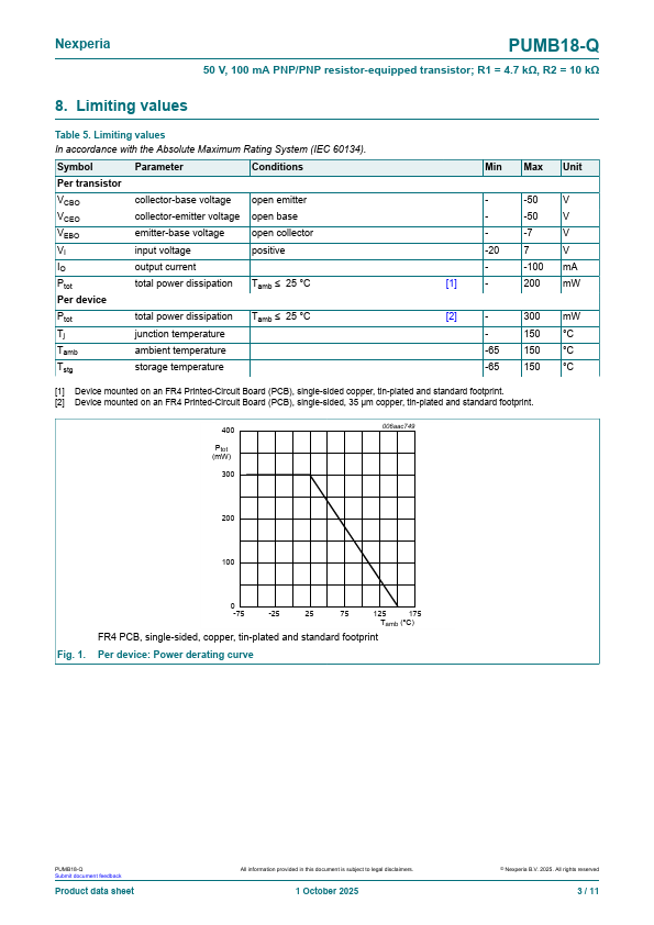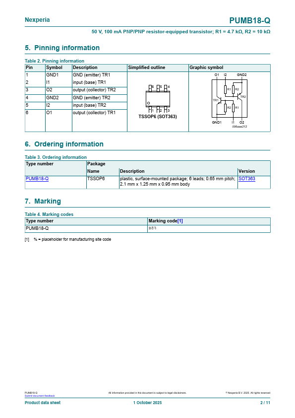 PUMB18-Q 50 V, 100 mA PNP/PNP resistor-equipped transistor; R1 = 4.7 kΩ, R2 = 10 kΩ 1 October 2025 Product data sheet 1.General .PUMB18-Q Features