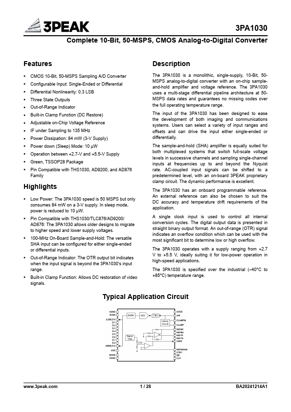 CMOS 10-Bit, 50-MSPS Sampling A/D Converter Configurable Input: Single-Ended or Differential Differential Nonlinearity: 0.3 LSB Three State Outputs Out-of-Range Indicator Built-in Clamp Function (DC Restore) Adjustable on-Chip Voltage Reference IF under Sampling to 135 MHz Power Dissipation:.