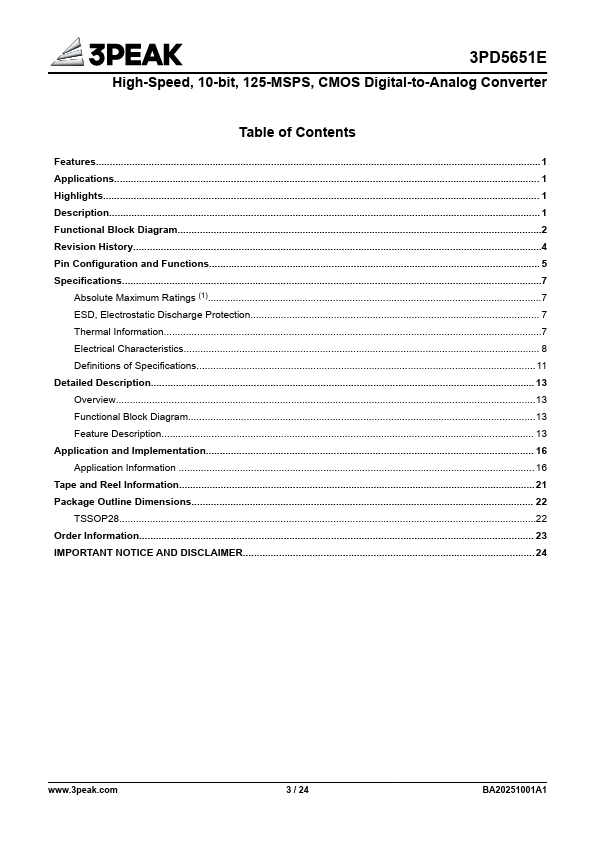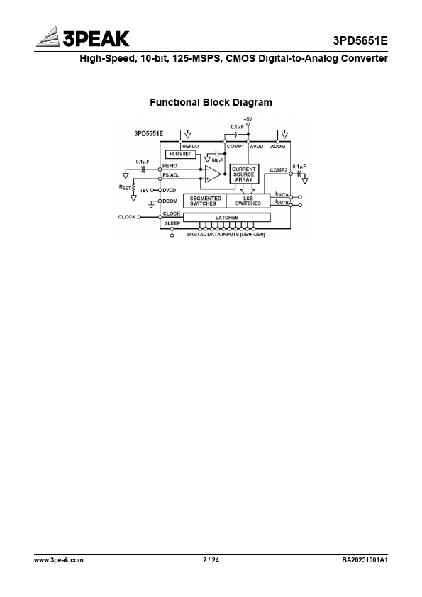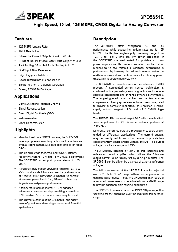 The 3PD5651E offers exceptional AC and DC performance while supporting update rates up to 125 MSPS. The flexible single-supply operating range from +2.7 V to +5.5 V and the low power dissipation of the 3PD5651E are well suited for portable and low power applications. Its power dissipation can be further reduced to 45 mW, without a significant degradation in performance, by lowering the full-scale current output.