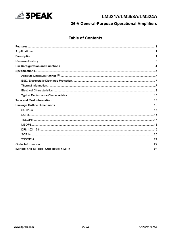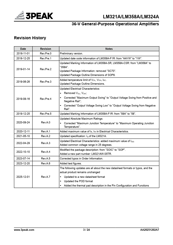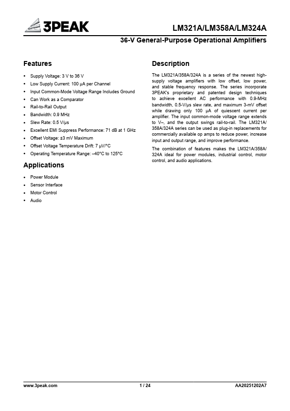 The LM321A/358A/324A is a series of the newest highsupply voltage amplifiers with low offset, low power, and stable frequency response. The series incorporate 3PEAK's proprietary and patented design techniques to achieve excellent AC performance with 0.9-MHz bandwidth, 0.5-V/μs slew rate, and maximum 3-mV offset while drawing only 100 μA of quiescent current per amplifier. The input mon-mode voltage range extends to...