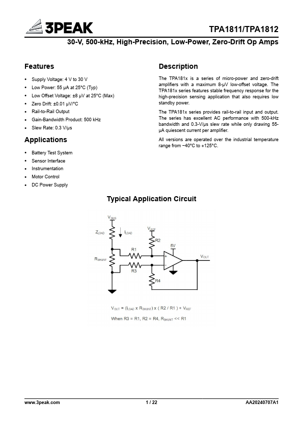 55 μA at 25°C (Typ) Low Offset Voltage: ±8 μV at 25°C (Max) Zero Drift: ±0.01 µV/°C Rail-to-Rail Output Gain-Bandwidth Product:.