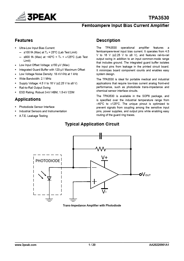 Ultra-Low Input Bias Current: ±100 fA (Max) at TA = 25°C (Lab Test Limit) ±800 fA (Max) at −40°C < TA < +125°C (Lab Test Limit) Low Input Offset Voltage: ±150 µV (Max) Integrated Guard Buffer with 120-µV Maximum Offset Low Voltage Noise Density:.
