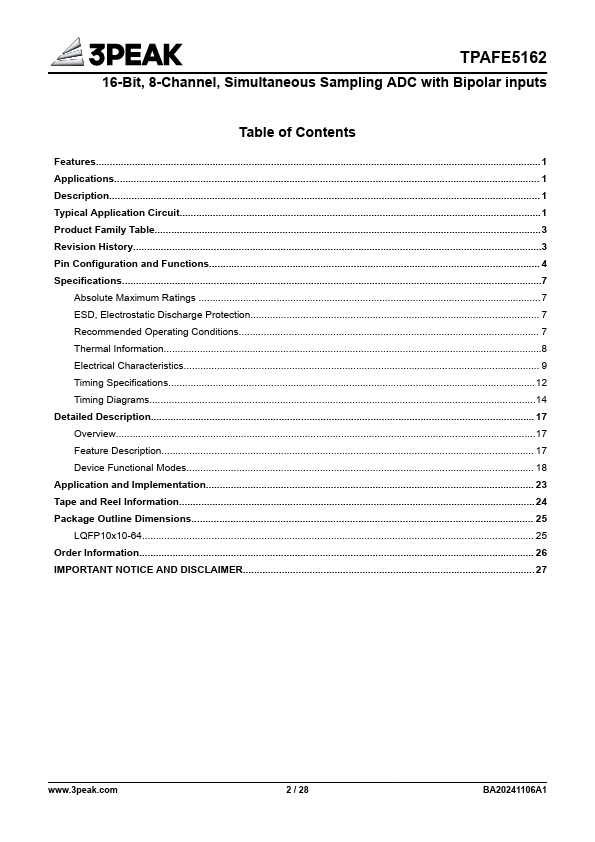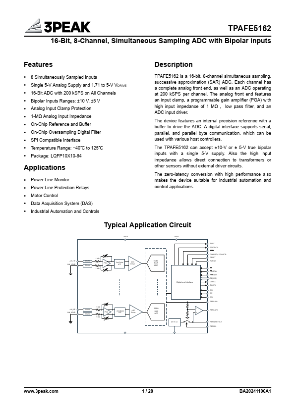 8 Simultaneously Sampled Inputs Single 5-V Analog Supply and 1.71 to 5-V VDRIVE 16-Bit ADC with 200 kSPS on All Channels Bipolar Inputs Ranges: ±10 V, ±5 V Analog Input Clamp Protection 1-MΩ Analog Input Impedance On-Chip Reference and Buffer On-Chip Oversampling Digital Filter SPI patible Interface Temperature Range: LQFP10X10-64 Applications Power Line Monitor Power Line Protection Relays Motor Control Data...