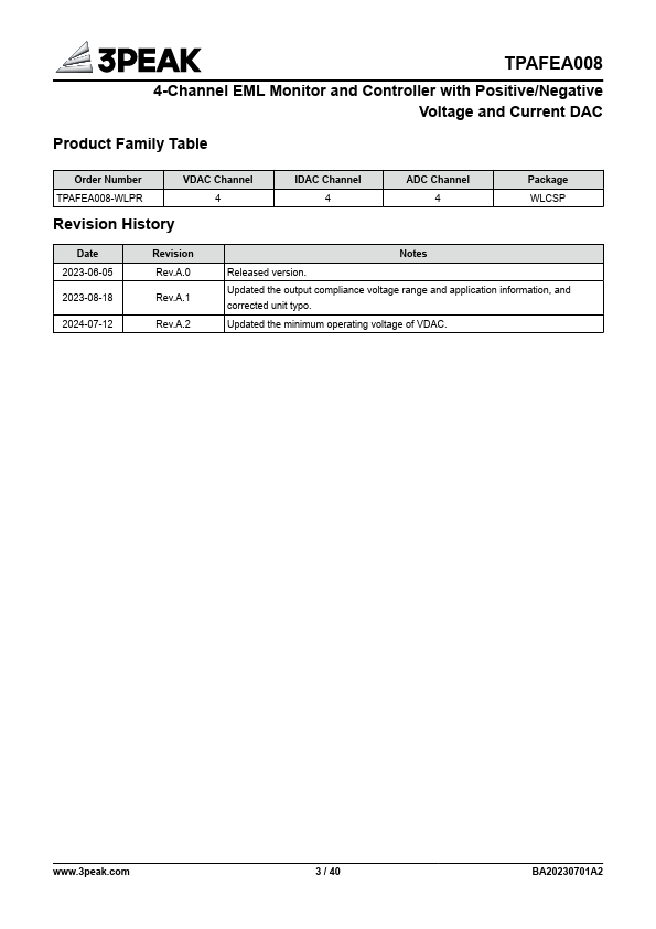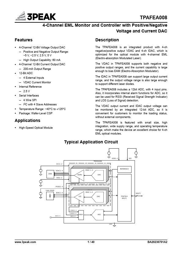 The TPAFEA008 is an integrated product with 4-ch negative/positive output VDAC and 4-ch IDAC, which is optimized for the optical module with 4-channel EML (Electro-absorption Modulated Laser). The VDAC in TPAFEA008 supports both negative and positive output ranges, and the current capability is large enough to bias EAM (Electro-Absorption Modulator). The IDAC in TPAFEA008 can support large output current range, and...