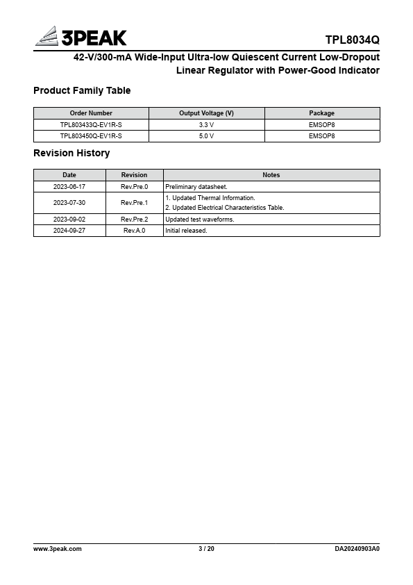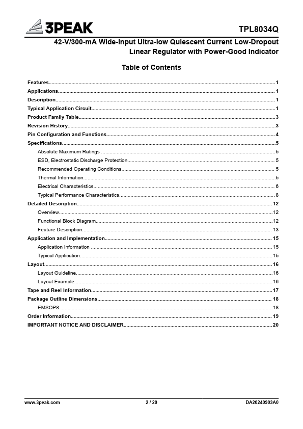 The TPL8034Q series supports operating with 3 V to 42 V (45-V maximum transient voltage). Operating with as low as 3 V allows the TPL8034Q to work well during cold-crank and start-stop conditions. The TPL8034Q products are 3-μA ultra-low quiescent low dropout voltage linear regulators with 300-mA maximum output current capability.