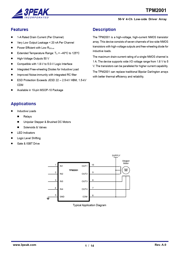 The TPM2001 is a high-voltage, high-current NMOS transistor array. This device consists of seven channels of low-side NMOS transistors with high-voltage outputs and free-wheeling diode for inductive loads. The maximum drain-current rating of a single NMOS channel is 1.