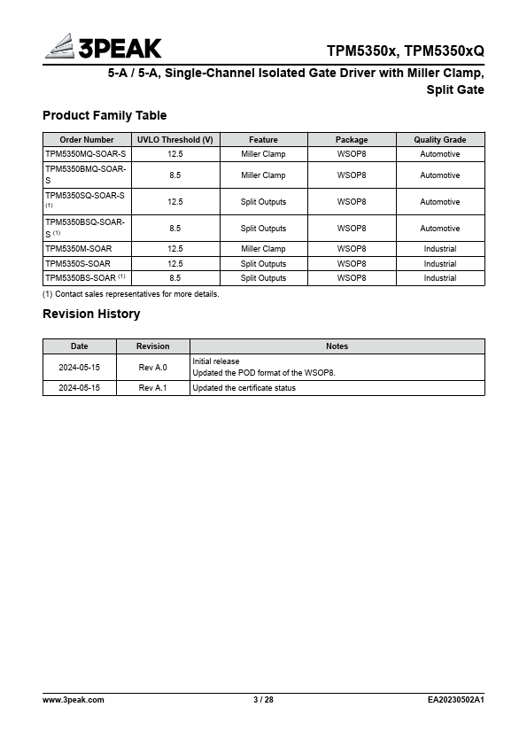 The TPM5350xQ driver is an automotive-grade singlechannel isolated gate driver for IGBTs, MOSFETs, and SiC MOSFETs. Its input is CMOS/TTL patible with the industrial standard wide-body WSOP8 package. Its driving capability can support a 5-A source and 5-A sink current.