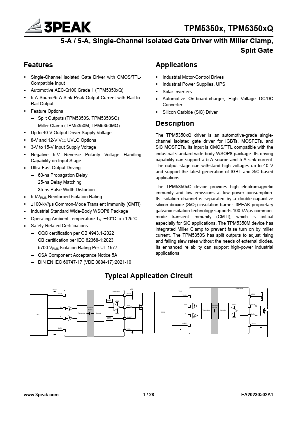 The TPM5350xQ driver is an automotive-grade singlechannel isolated gate driver for IGBTs, MOSFETs, and SiC MOSFETs. Its input is CMOS/TTL patible with the industrial standard wide-body WSOP8 package. Its driving capability can support a 5-A source and 5-A sink current.