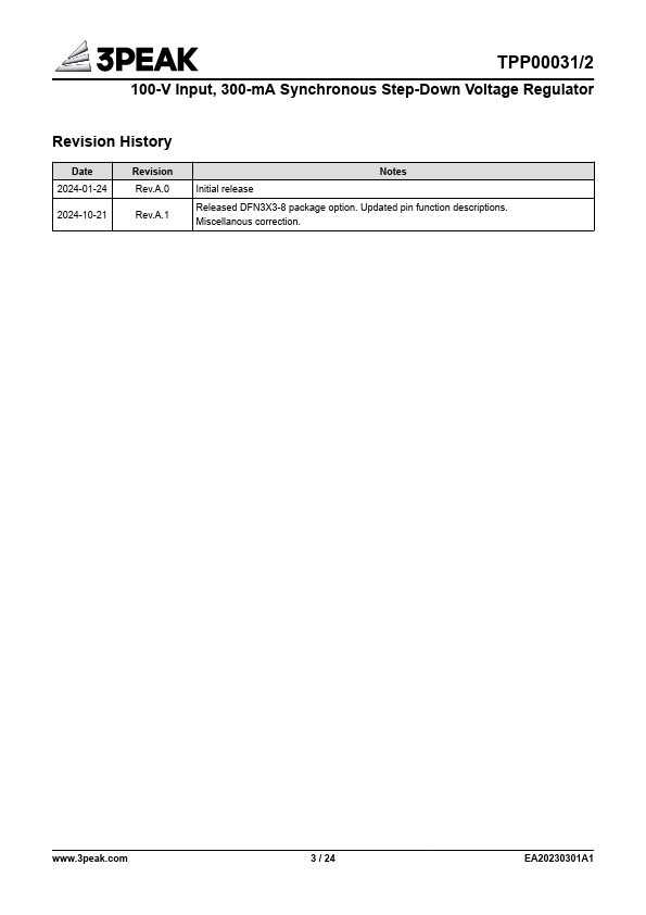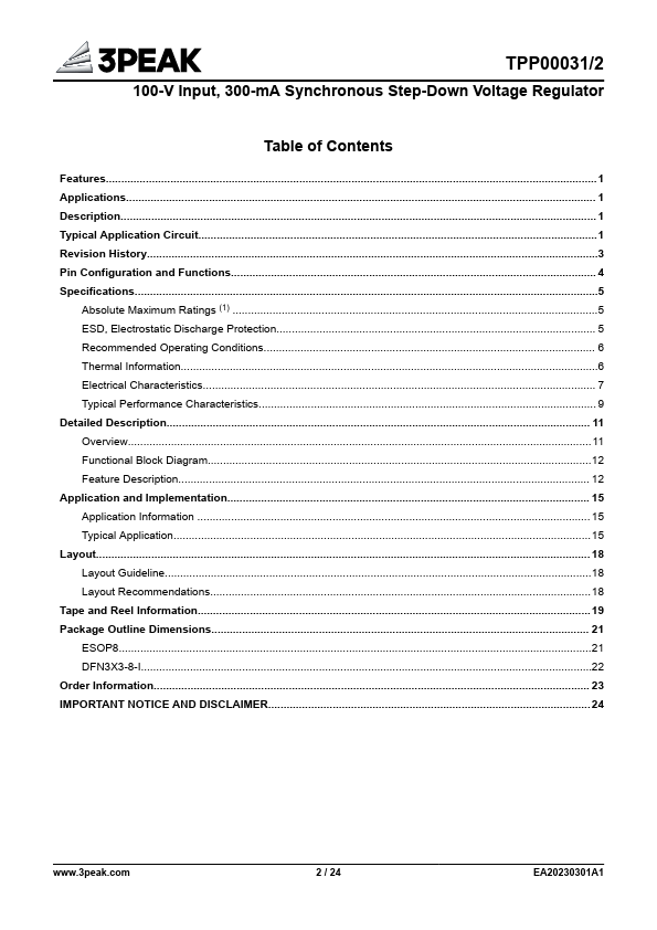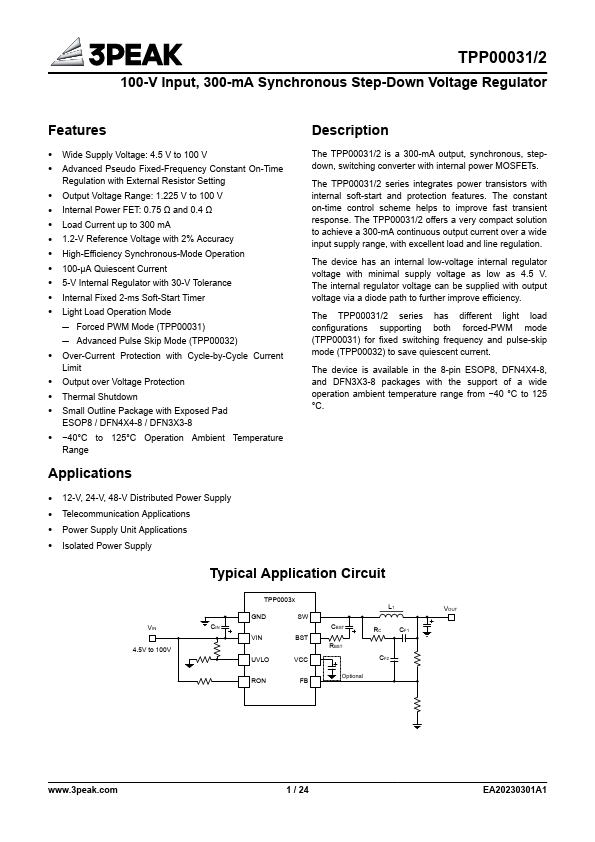 4.5 V to 100 V Advanced Pseudo Fixed-Frequency Constant On-Time Regulation with External Resistor Setting Output Voltage Range: 1.225 V to 100 V Internal Power FET: The TPP00031/2 series integrates power transistors with internal soft-start and protection.