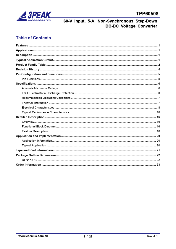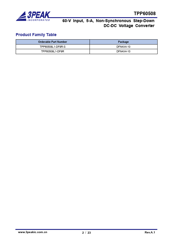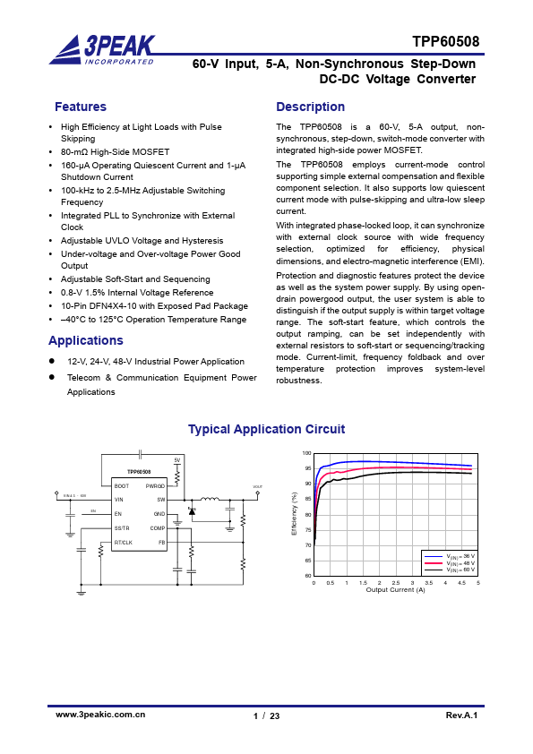 The TPP60508 is a 60-V, 5-A output, nonsynchronous, step-down, switch-mode converter with integrated high-side power MOSFET. The TPP60508 employs current-mode control supporting simple external pensation and flexible ponent selection. It also supports low quiescent current mode with pulse-skipping and ultra-low sleep current.