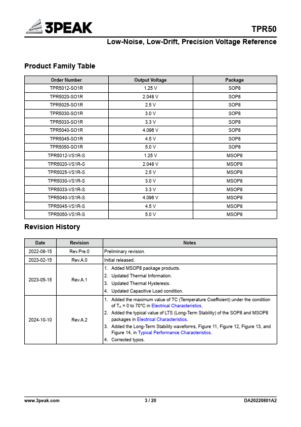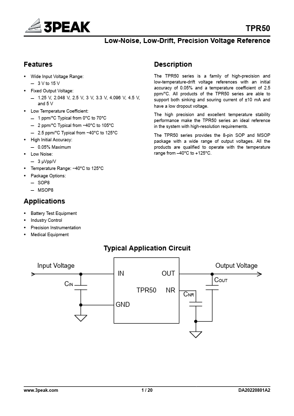 Wide Input Voltage Range: 3 V to 15 V Fixed Output Voltage: 1.25 V, 2.048 V, 2.5 V, 3 V, 3.3 V, 4.096 V, 4.5 V, and 5 V Low Temperature Coefficient:.